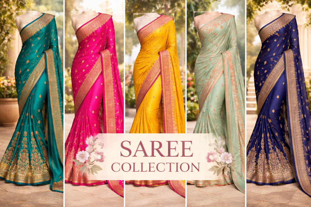 If you love contemporary styles, explore the designer saree collections available locally. These include chiffon, georgette, organza, and net sarees with embroidery, sequins, and stone work that are ideal for receptions and parties.